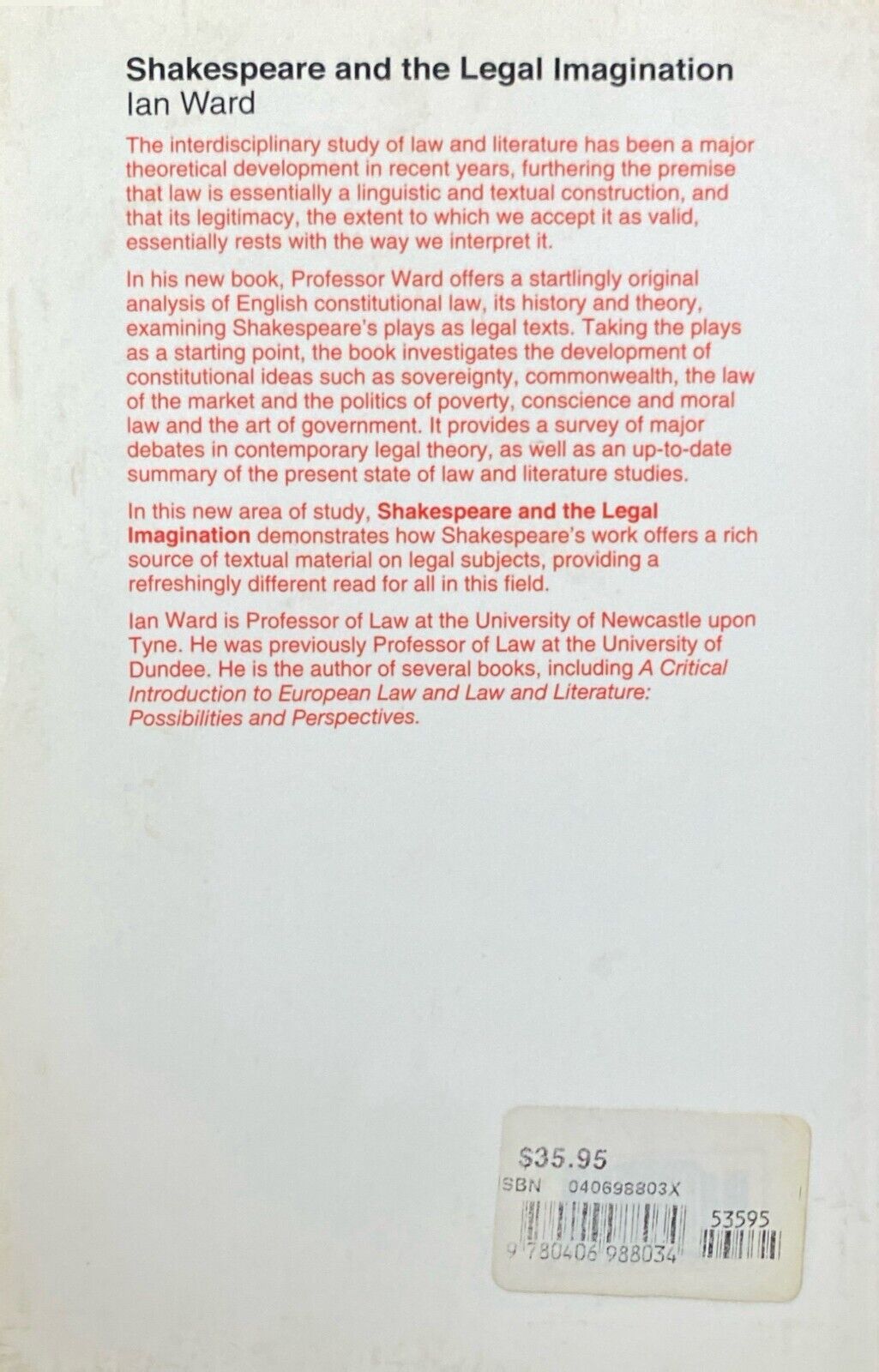 Shakespeare and the Legal Imagination by Ian Ward 1999 Butterworths paperback in very good condition.