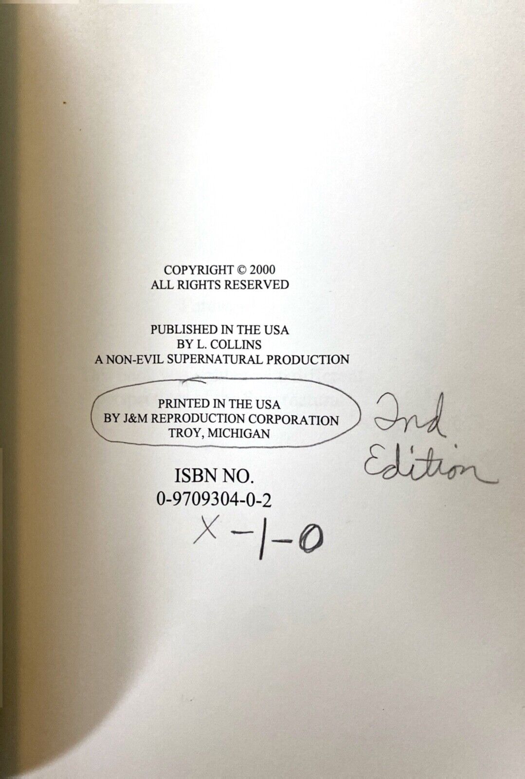 The Haunter's Manual - A Guide to the Supernatural by L. Collins, 2000 Non-Evil Supernatural Production paperback. Extensive writing throughout, looks primarily if not exclusively pencil. "2nd edition" written in pencil on copyright page, unable to verify veracity.