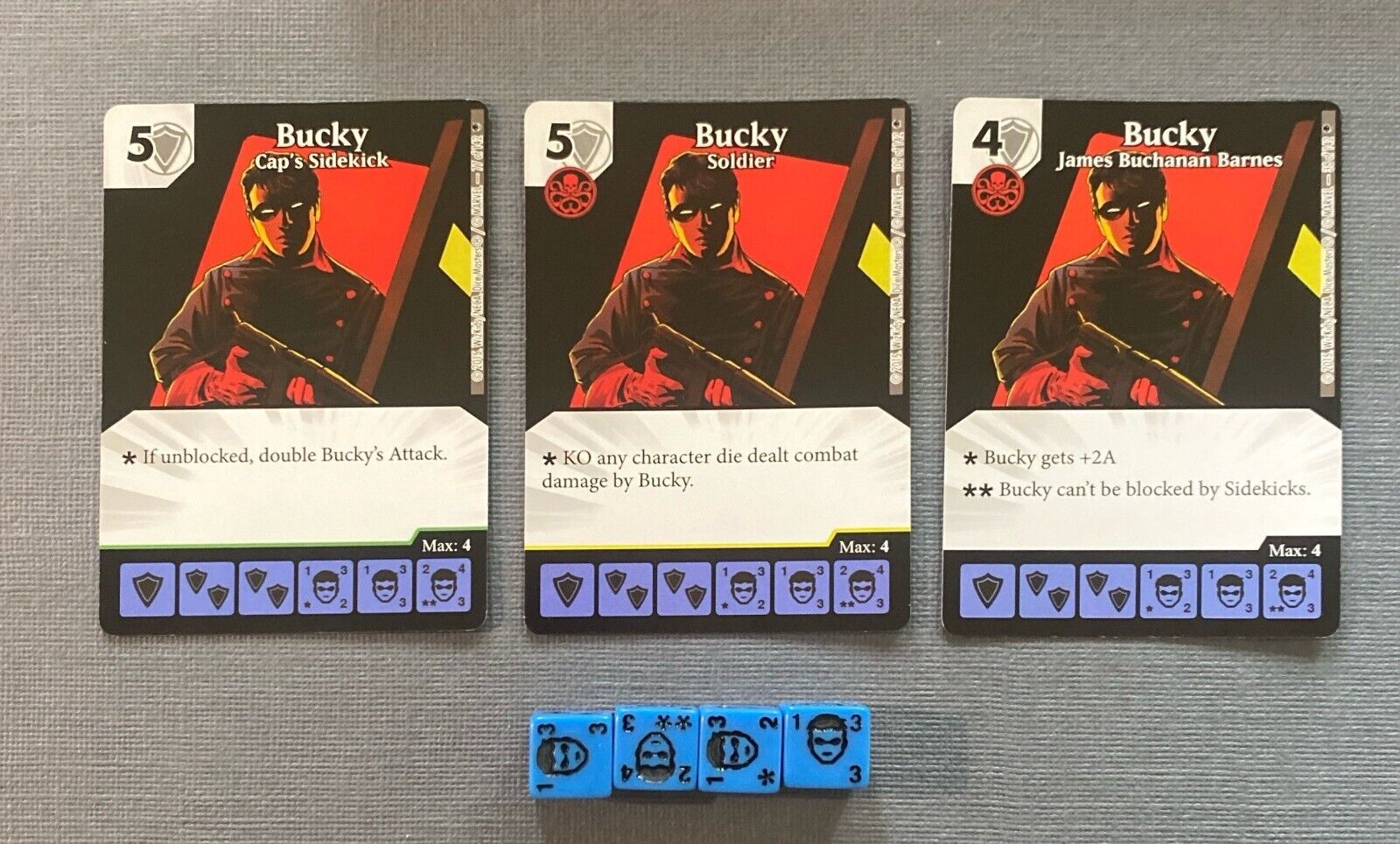 Complete set of 3 Bucky cards from WizKids Marvel Age of Ultron Dice Masters. Includes all three common, uncommon and rare cards plus 4 associated dice.